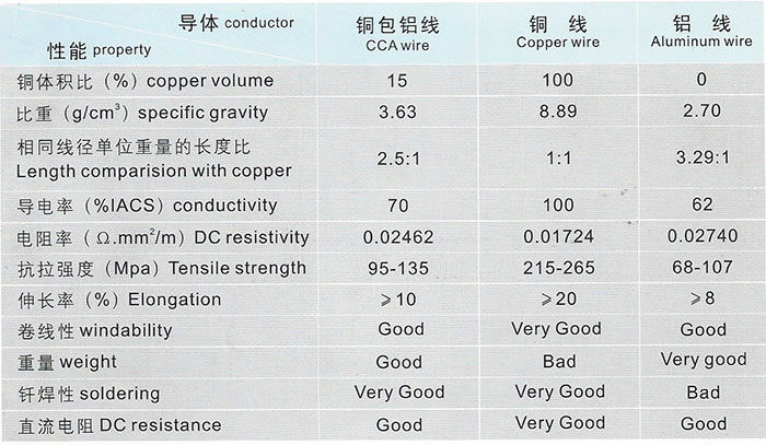 铜包铝线、铜线、铝线的物理和机械性能对照表